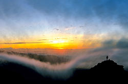 雪羊在玉山主峰遇見了令人屏息的飄渺曙光,雲氣如巨龍般翻騰捲動,在海面映出一片燦爛的金黃,那份感動長存於心,歷久彌新。