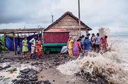 村民們築起人牆,保護一家小茶鋪免受風暴的襲擊。近年來,頻繁的強烈氣旋迅速侵蝕孫德爾本斯,嚴重的破壞對數百萬居民造成威脅。